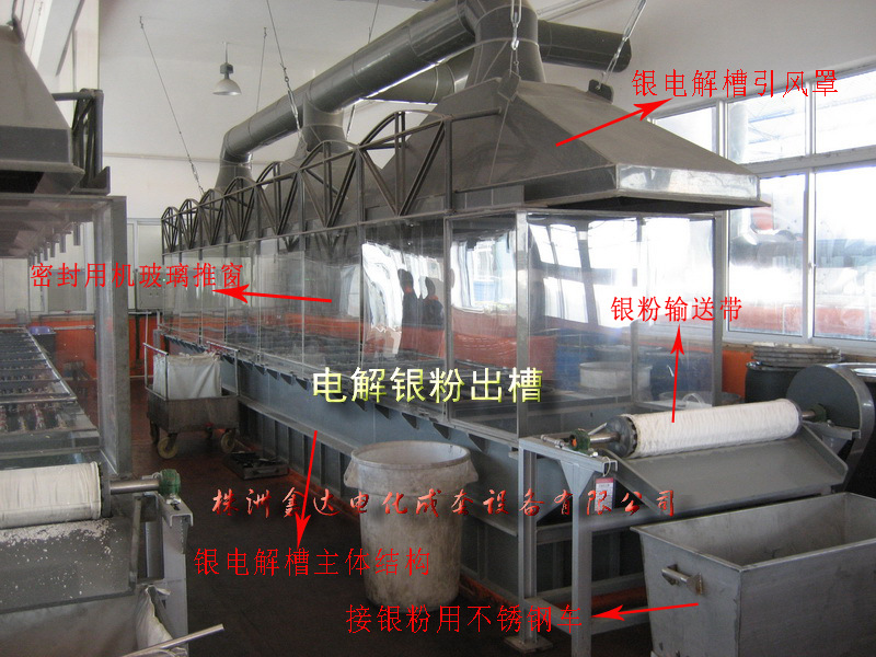 传统输送带结构银电解槽,银粉通过输送带运送到接银粉车,特点是结构简单,加工方便。半自动机械搅拌,需要人工铲刮银粉。是目前用的最普遍的银电解提纯生产加工方式。